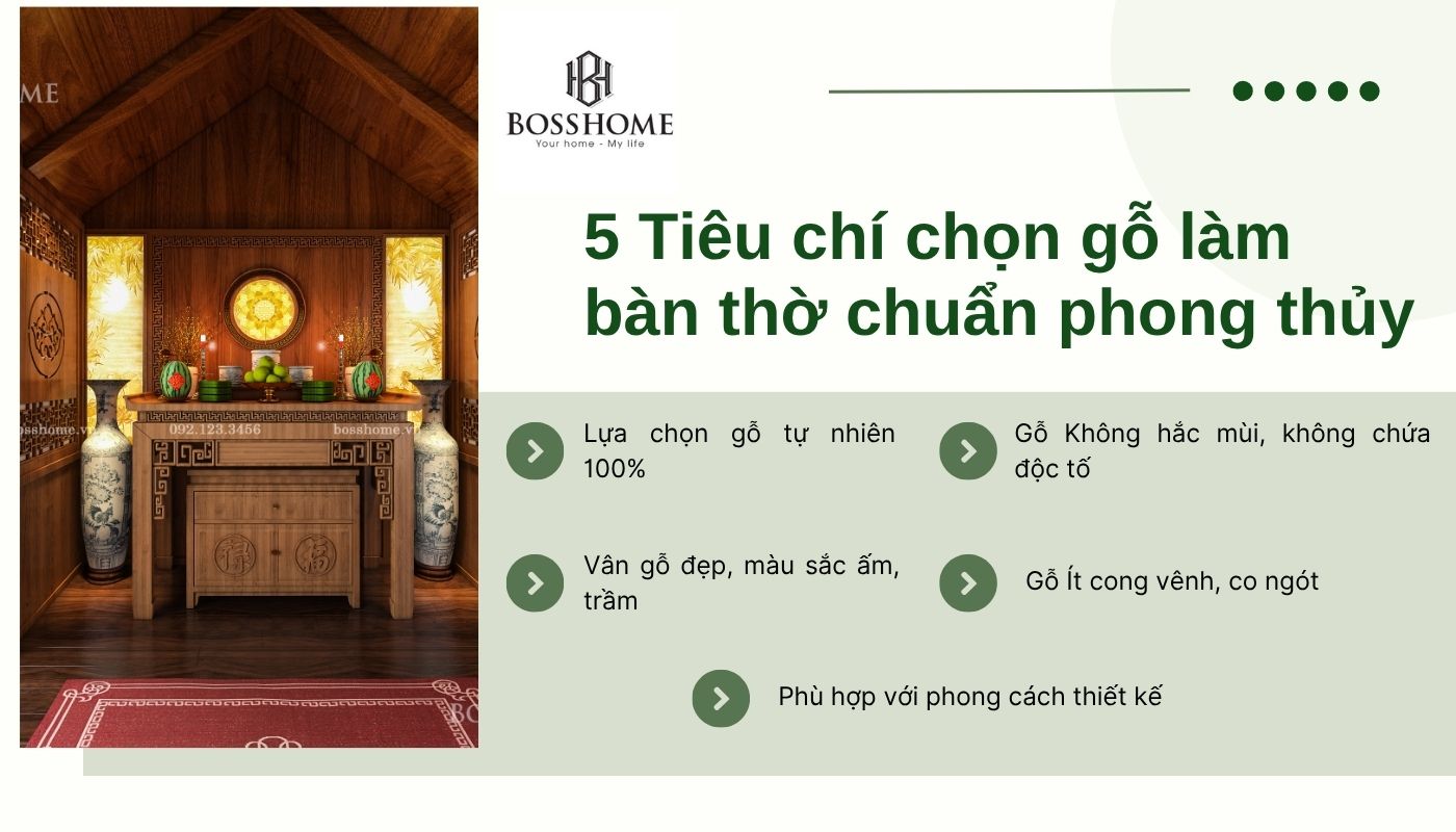 Việc áp dụng đầy đủ 5 tiêu chí trên sẽ giúp gia chủ có được một bàn thờ chuẩn phong thủy, vừa đẹp mắt vừa bền vững, thể hiện lòng thành kính với tổ tiên và mang lại may mắn cho gia đình.