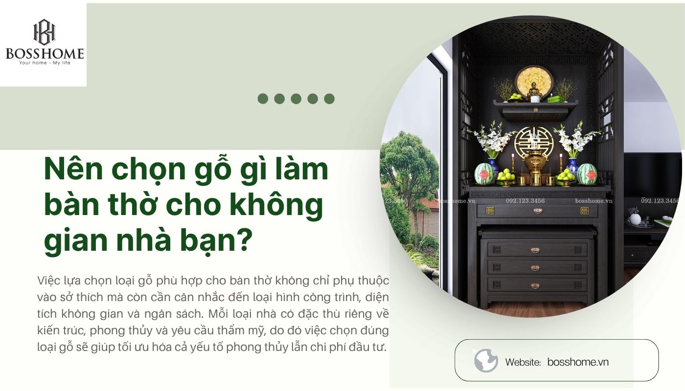 Việc lựa chọn loại gỗ phù hợp cho bàn thờ không chỉ phụ thuộc vào sở thích mà còn cần cân nhắc đến loại hình công trình, diện tích không gian và ngân sách. Mỗi loại nhà có đặc thù riêng về kiến trúc, phong thủy và yêu cầu thẩm mỹ, do đó việc chọn đúng loại gỗ sẽ giúp tối ưu hóa cả yếu tố phong thủy lẫn chi phí đầu tư.